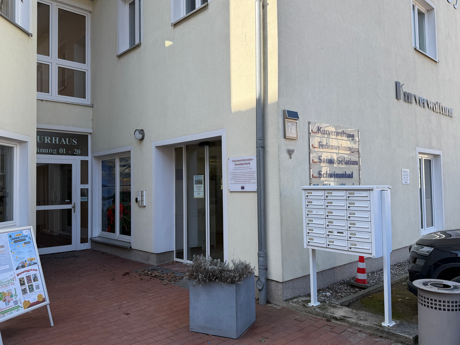Vom REFUGIUM RERIK aus erreichst du die Kurverwaltung in der Dünenstraße 7 bequem in nur etwa 5 Minuten zu Fuß. Der kurze Spaziergang durch das Zentrum macht es dir leicht, auch spontan vorbeizuschauen, um dir Tipps für den nächsten Ausflug zu holen oder das aktuelle Veranstaltungsprogramm einzusehen.
